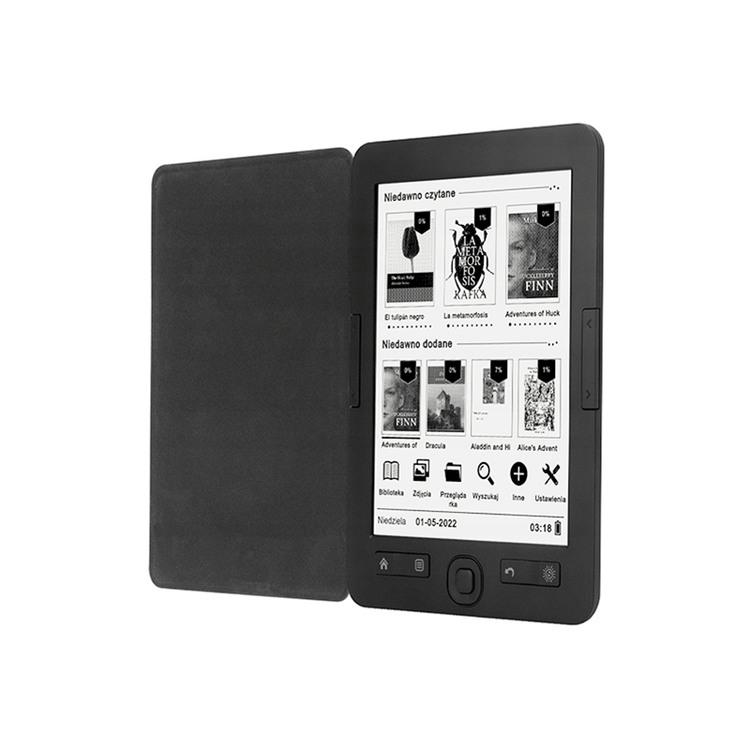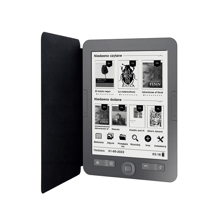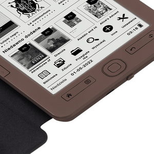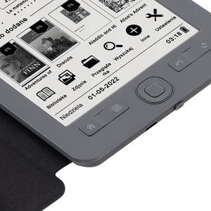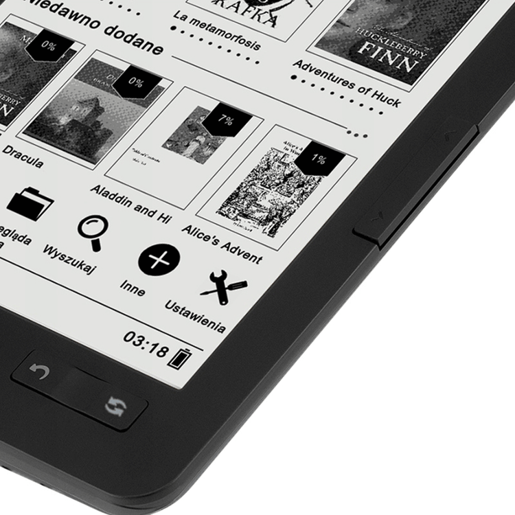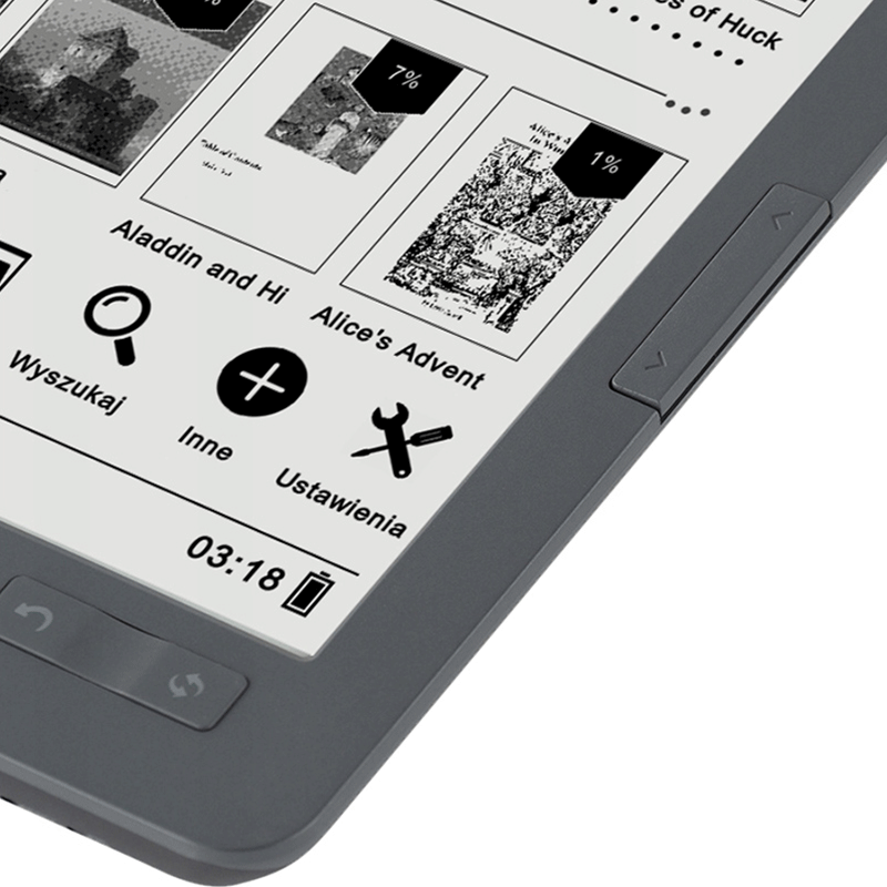 Ekran eink z 16-stopniową skalą szarości, imituje efekt tradycyjnego druku na papierze. Rozdzielczości 1024x758, 212 ppi zapewnia super komfortowe czytanie bez zmęczenia oczu. Tekst jest wyraźny i łatwy do odczytu.