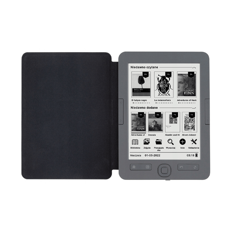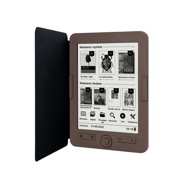 Czytnik posiada skórzany pokrowiec przymocowanym do tylniej obudowy dla Twojej wygody użytkowania oraz ochrony urządzenia.