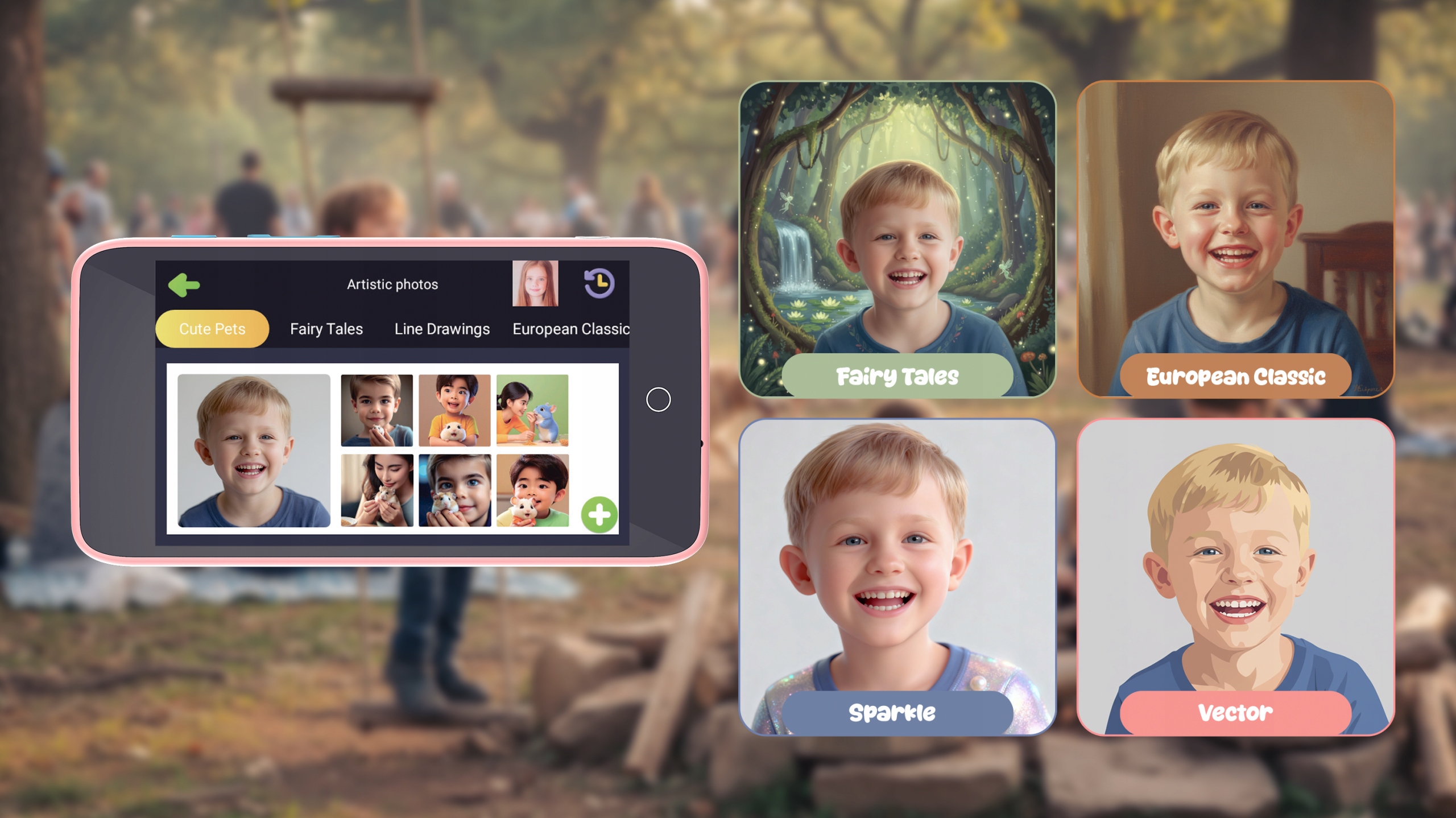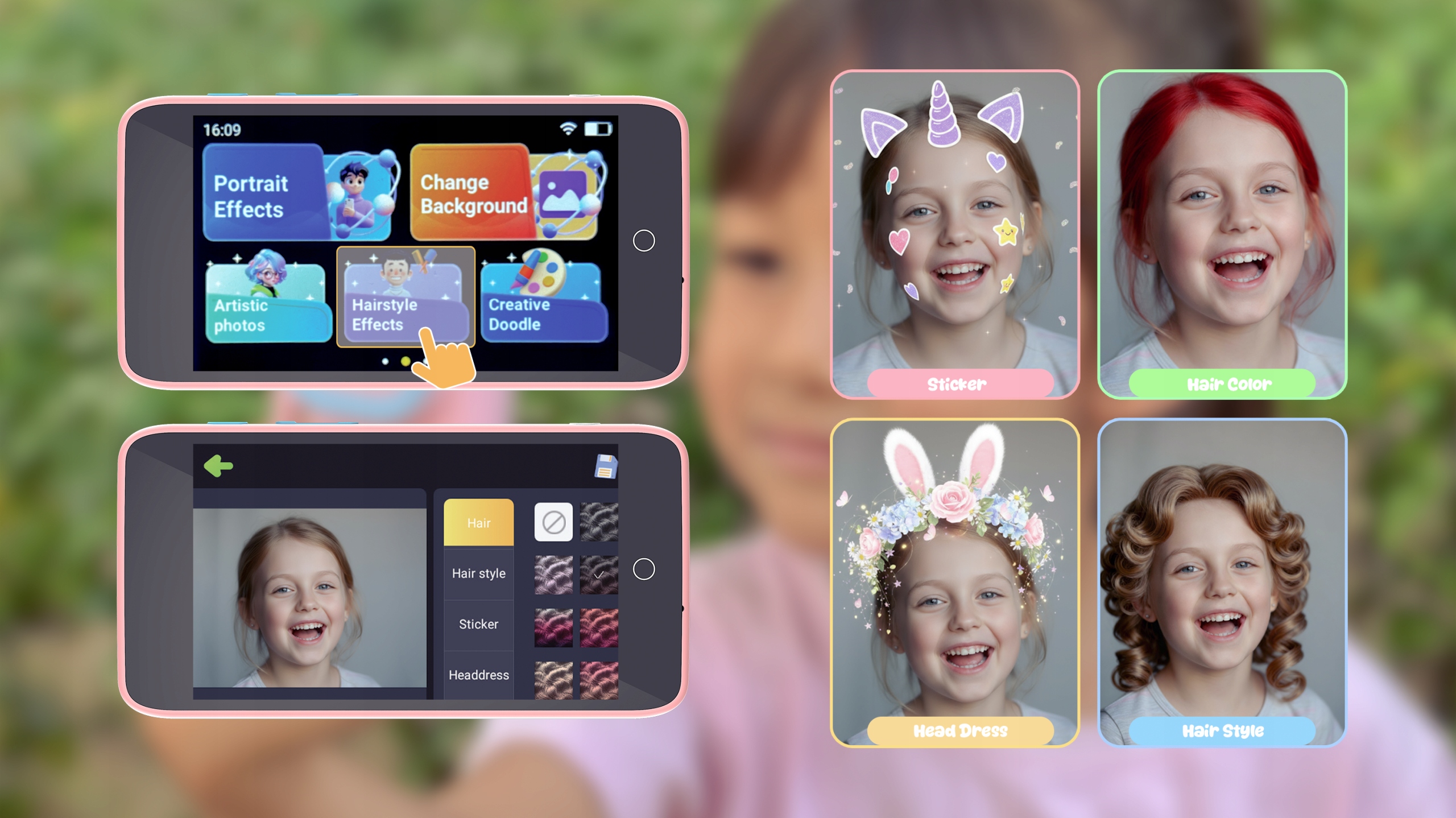 Experiment with fun and colourful looks using the AI hairstyle effect. Children can instantly change hair colours, hairstyles, add stickers and accessories — it's a creative way to express their personality and imagination.