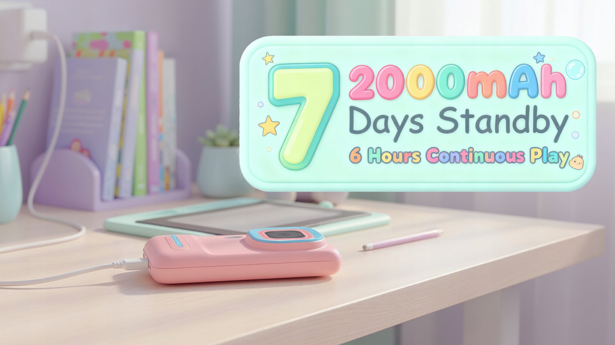 The 2000mAh lithium-polymer battery provides up to 7 days of standby time or 6 hours of continuous use — perfect for school trips, outdoor activities and everyday explorations.