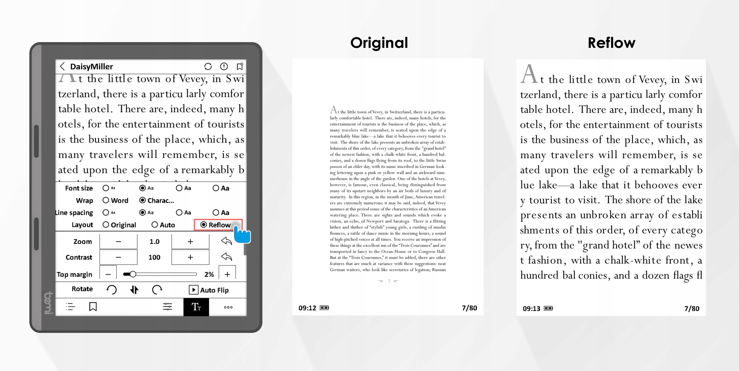 Cognita Tab 5 supports the very useful Reflow function for PDF files. Reflow breaks down the content of a PDF file so that it can be read as text, just like in an epub or fb2 file. The text automatically adjusts to the page size, making reading pleasant and comfortable. The text can also be enlarged, which is not possible when reading the original PDF file.