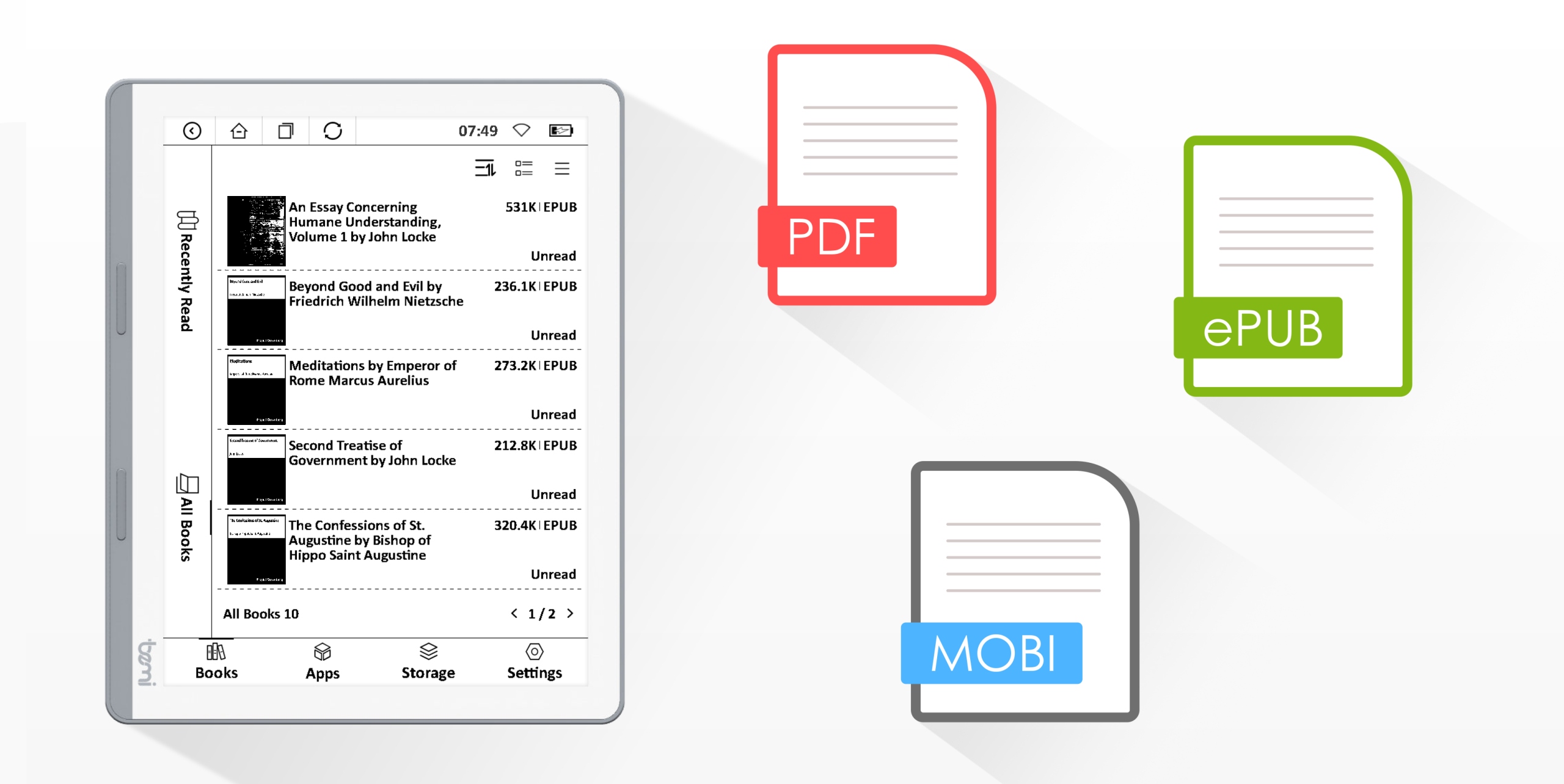 The Cognita Tab 5 supports most available e-book formats, such as: PDF (Reflow), epub, MOBI (mobipocket), FB2, FB2.ZIP, AZW, AZW3, CHM, PRC, DOC, DOCX, TXT, HTM, HTML, RTF.