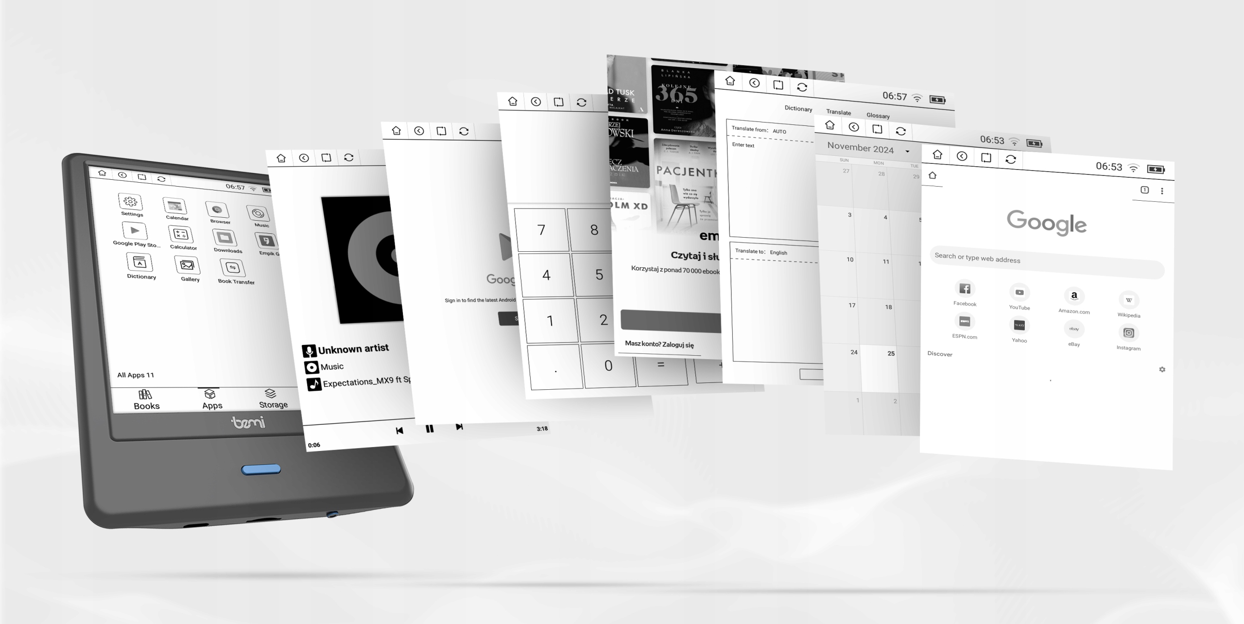 - Built-in additional applications: Empik Go, Book Transfer, Audio Player, Calculator, Dictionary, Translator, File Manager, Gallery, Web Browser, Navigation Ball