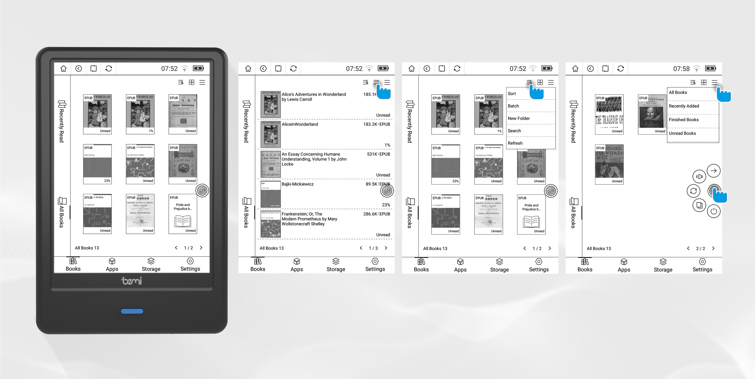 Additionally, you can sort the library, perform batch operations, create a new folder, search for a book or refresh the library directly from the home screen.