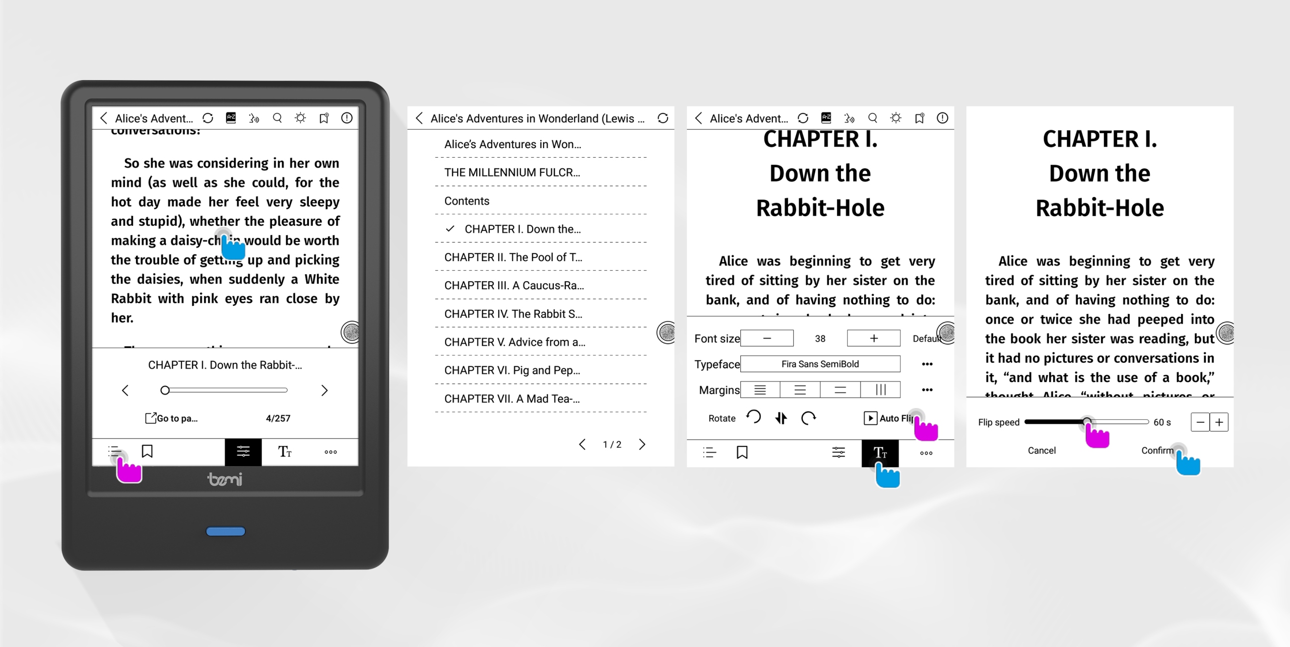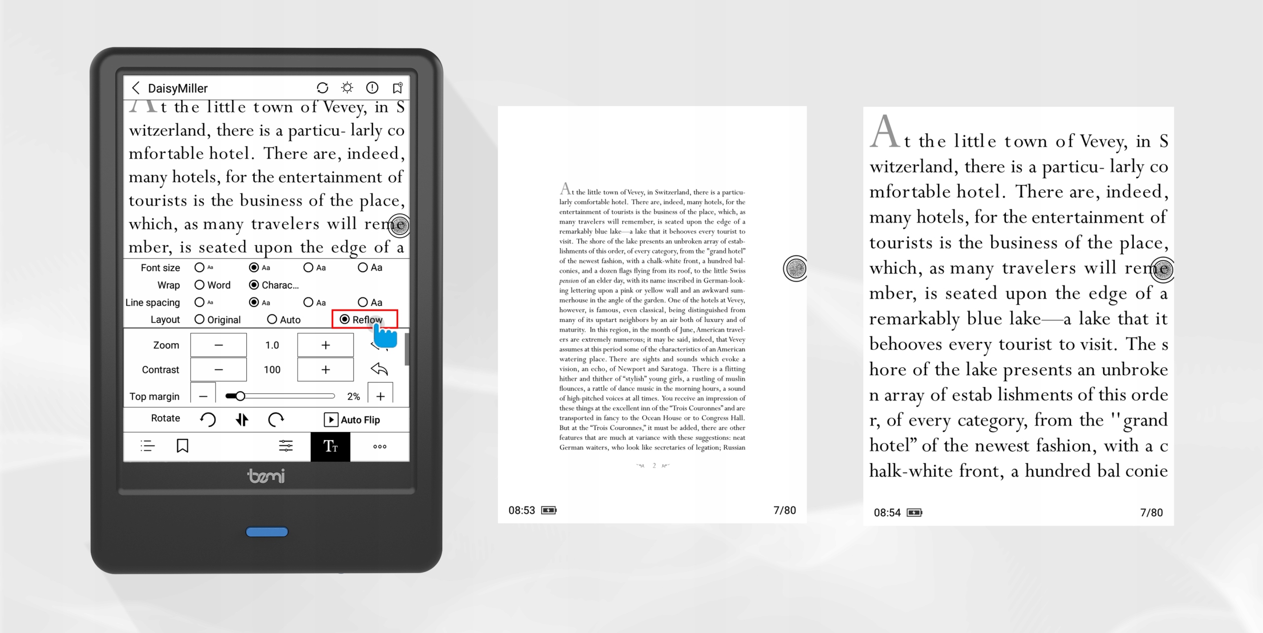 The e-ink screen with a 16-step grey scale imitates the effect of traditional paper printing. The resolution of 1024x758, 212 ppi ensures super comfortable reading without eye strain. The text is clear and easy to read.