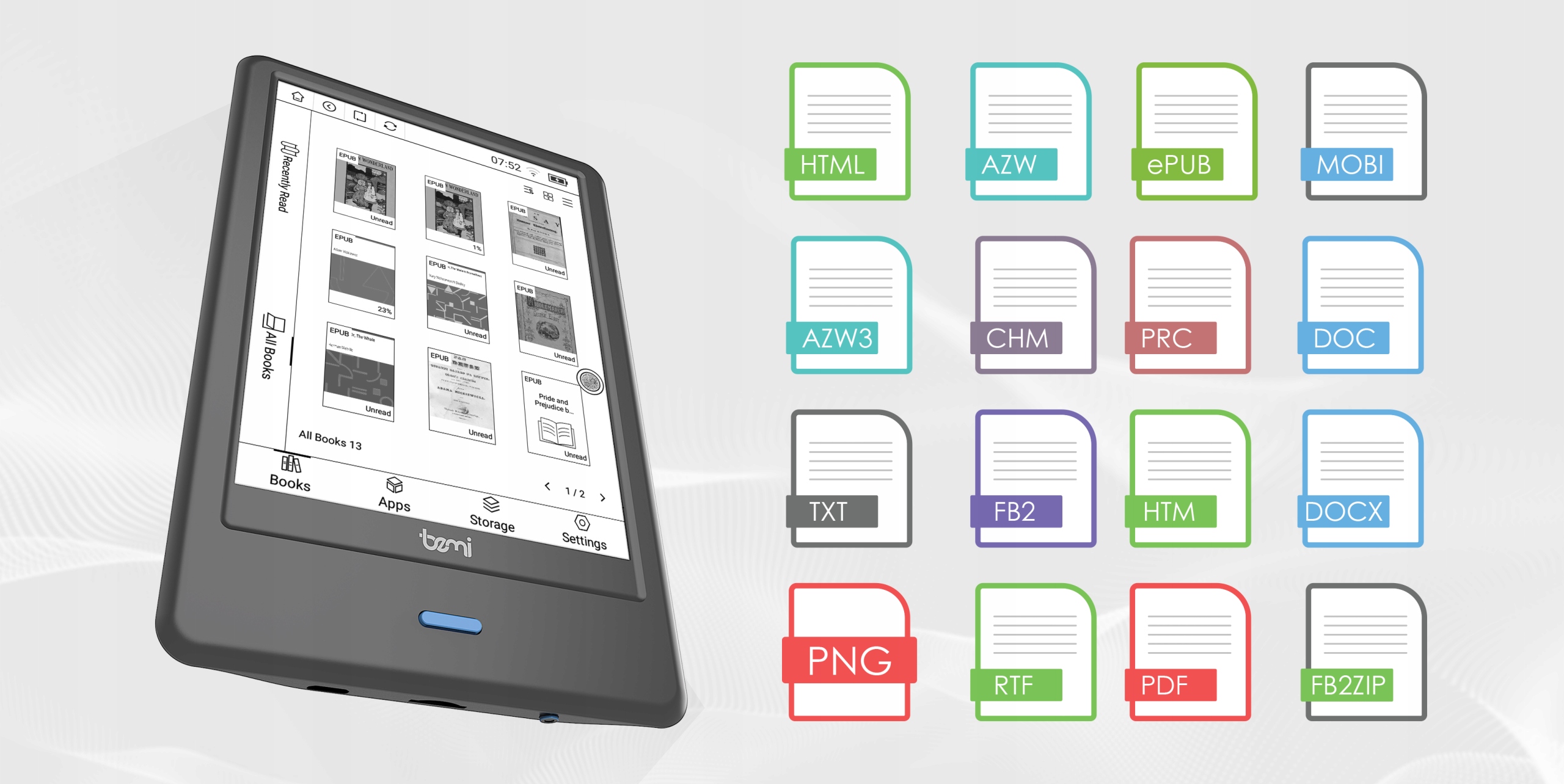 The Cognita Tab 6 supports most available e-book formats, such as PDF (Reflow), epub, MOBI (mobipocket), FB2, FB2.ZIP, AZW, AZW3, CHM, PRC, DOC, DOCX, TXT, HTM, HTML, and RTF.