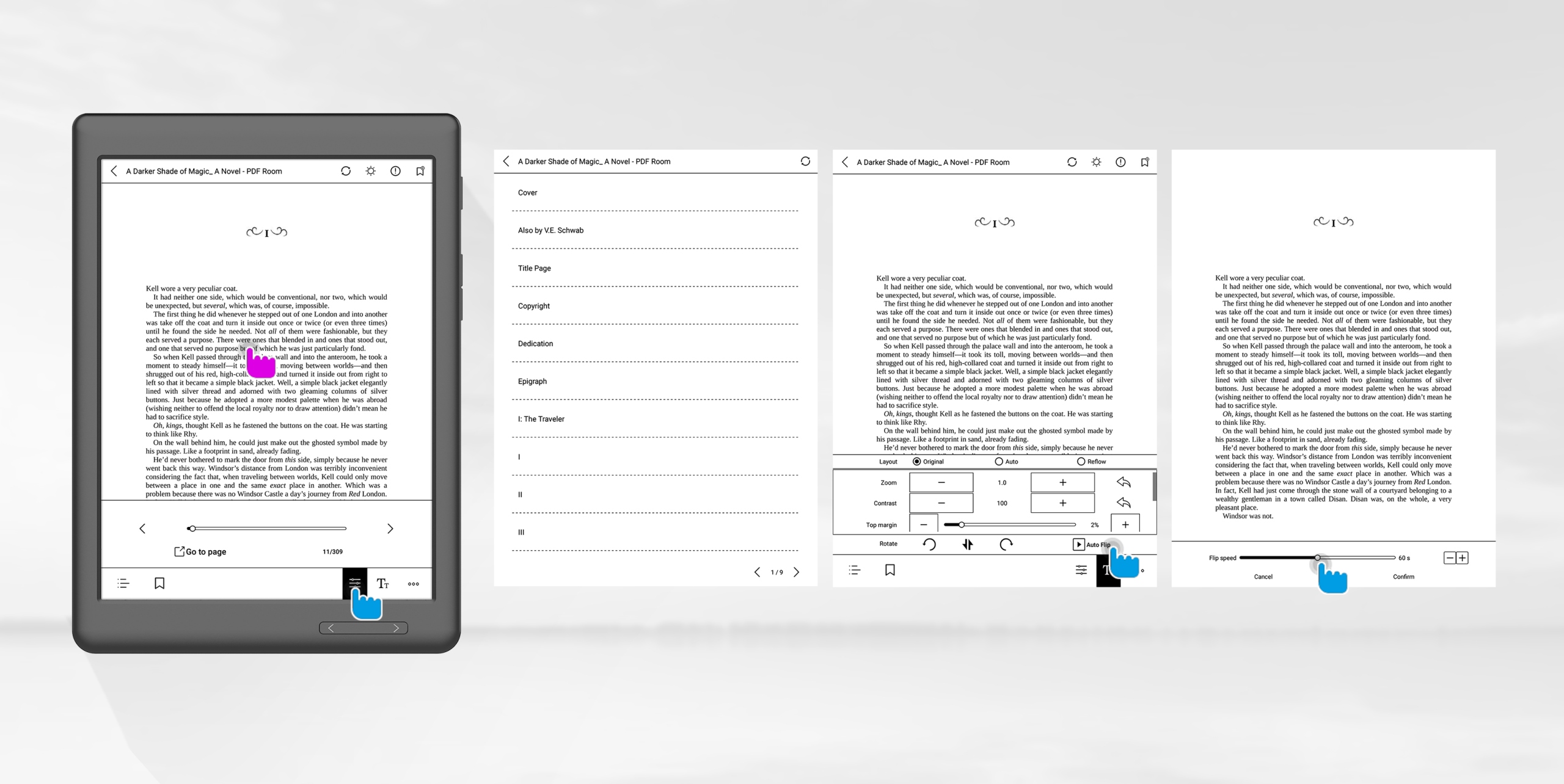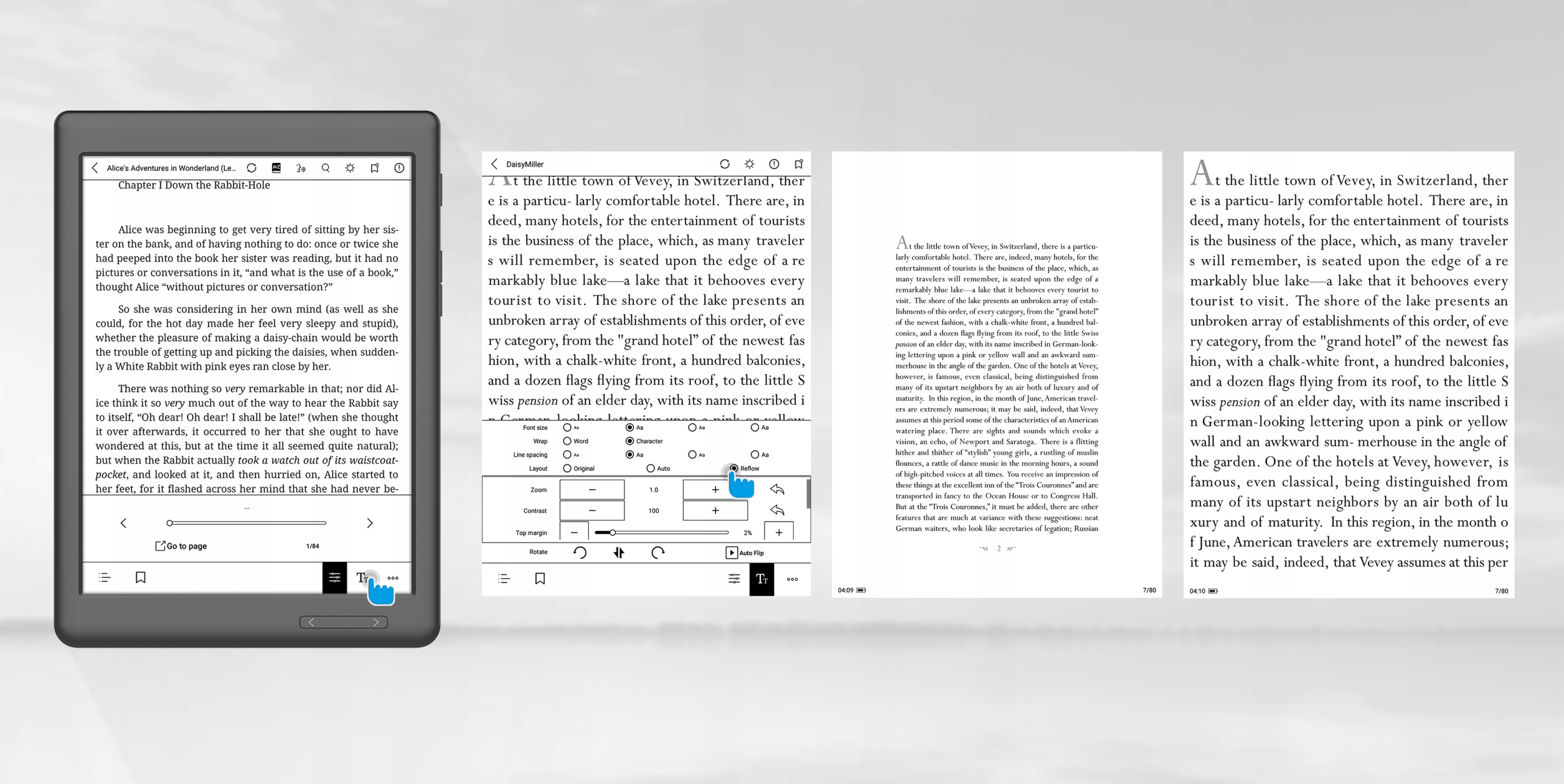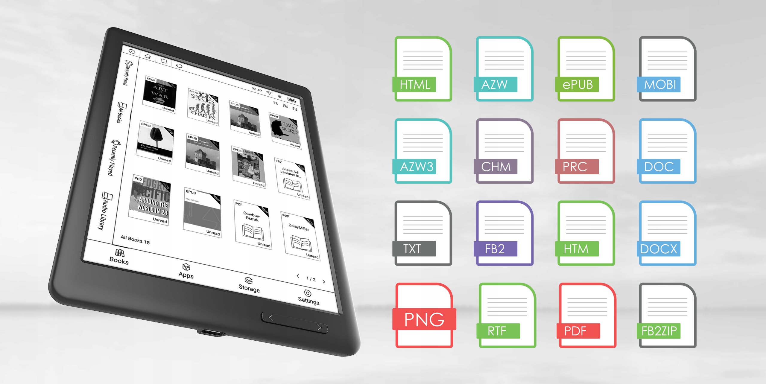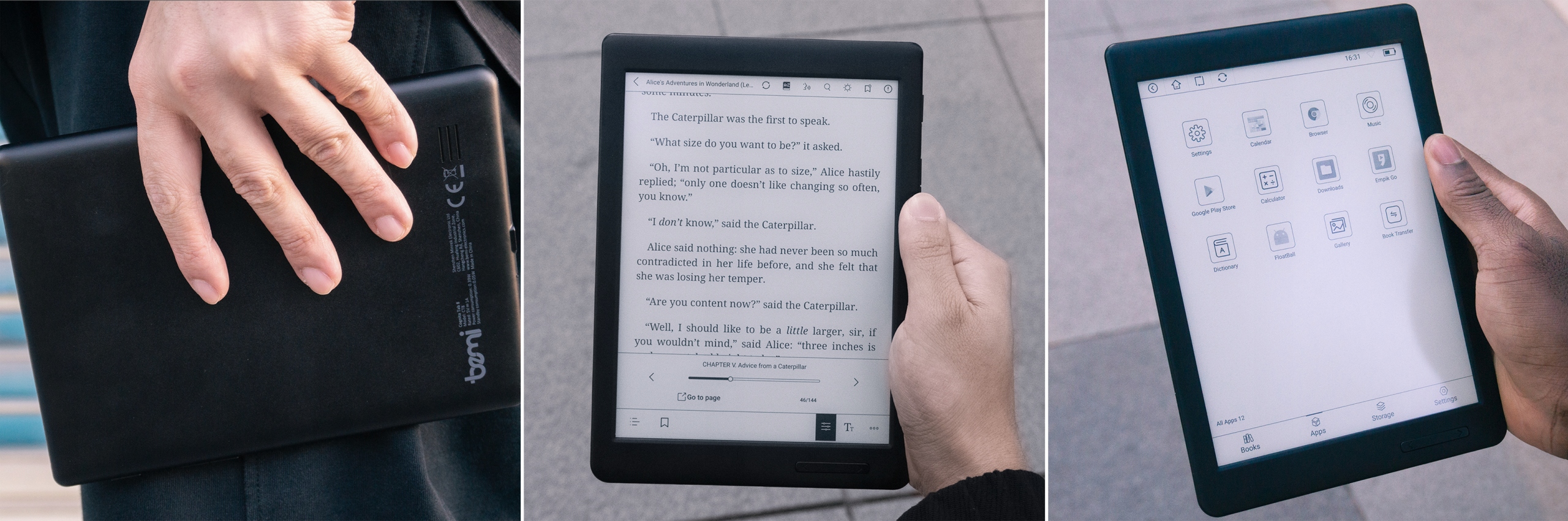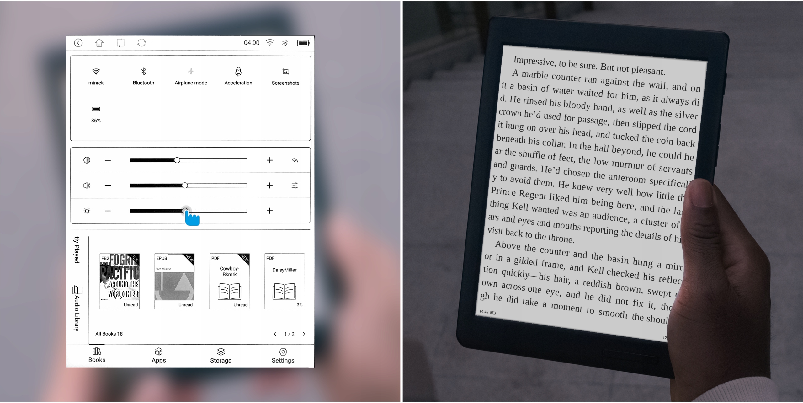 The reader has a large 7.8" e-ink screen with Carta technology, a built-in touch panel and LED backlighting with adjustable brightness. It impresses with its convenience, practicality and ease of touch operation.