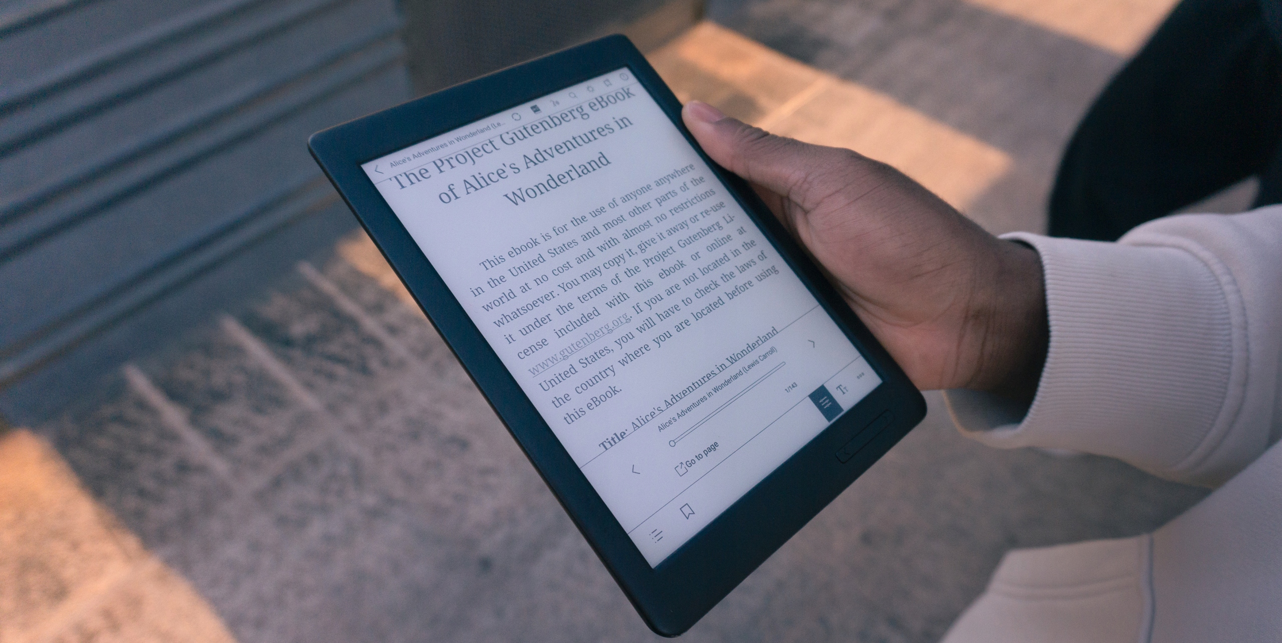At 9.5 mm thick and weighing 305 g, the reader fits comfortably in your hand. You can always have it with you. Whether you're travelling far or near, on your way from school or work, during a business meeting or on your comfortable sofa at home, it will work in all circumstances.