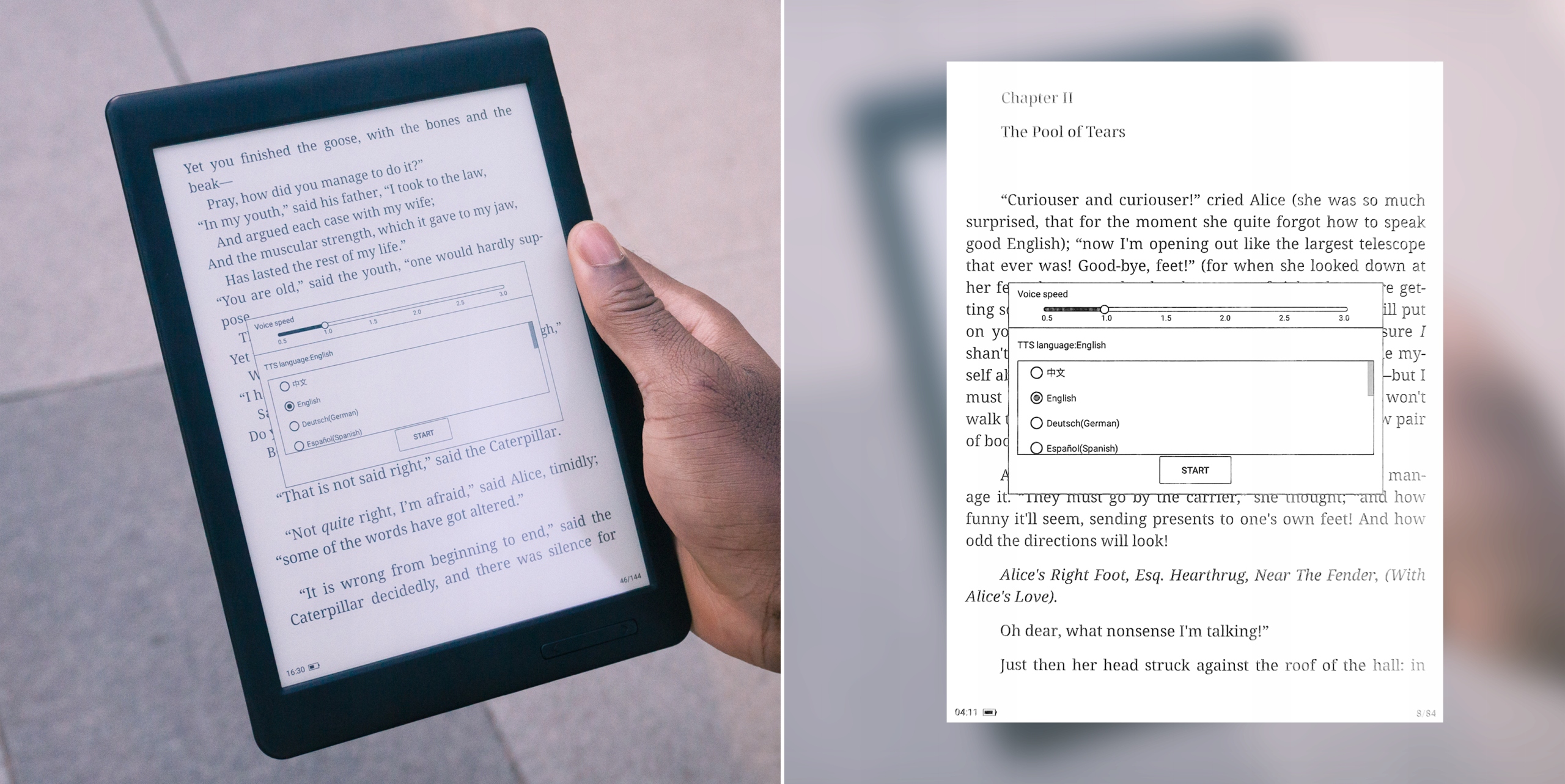 TTS – text to speech – is a speech synthesiser or a function that converts written text into sound. Thanks to this function, Cognita Tab 8 allows you to turn a book you are reading into an audiobook.