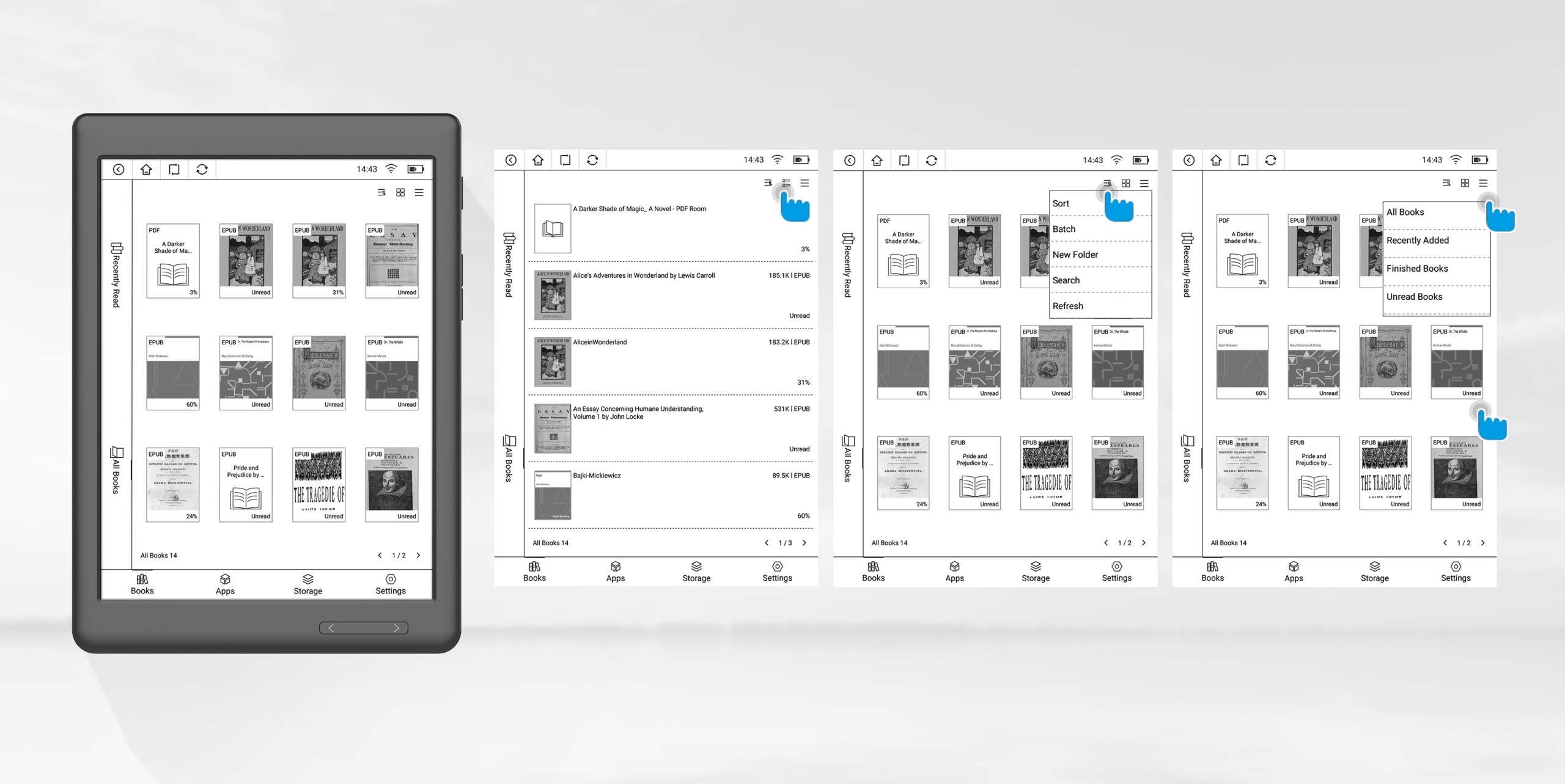 Additionally, you can sort the library, perform batch operations, create a new folder, search for a book, or refresh the library directly from the home screen.