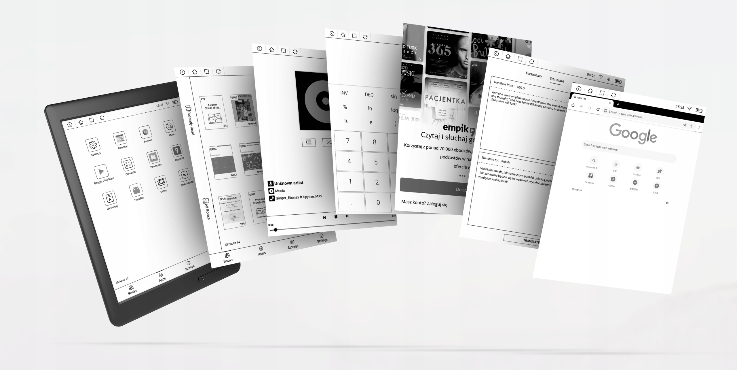 - Built-in additional applications: Empik Go, Book Transfer, Audio Player, Calculator, Dictionary, Translator, File Manager, Gallery, Web Browser