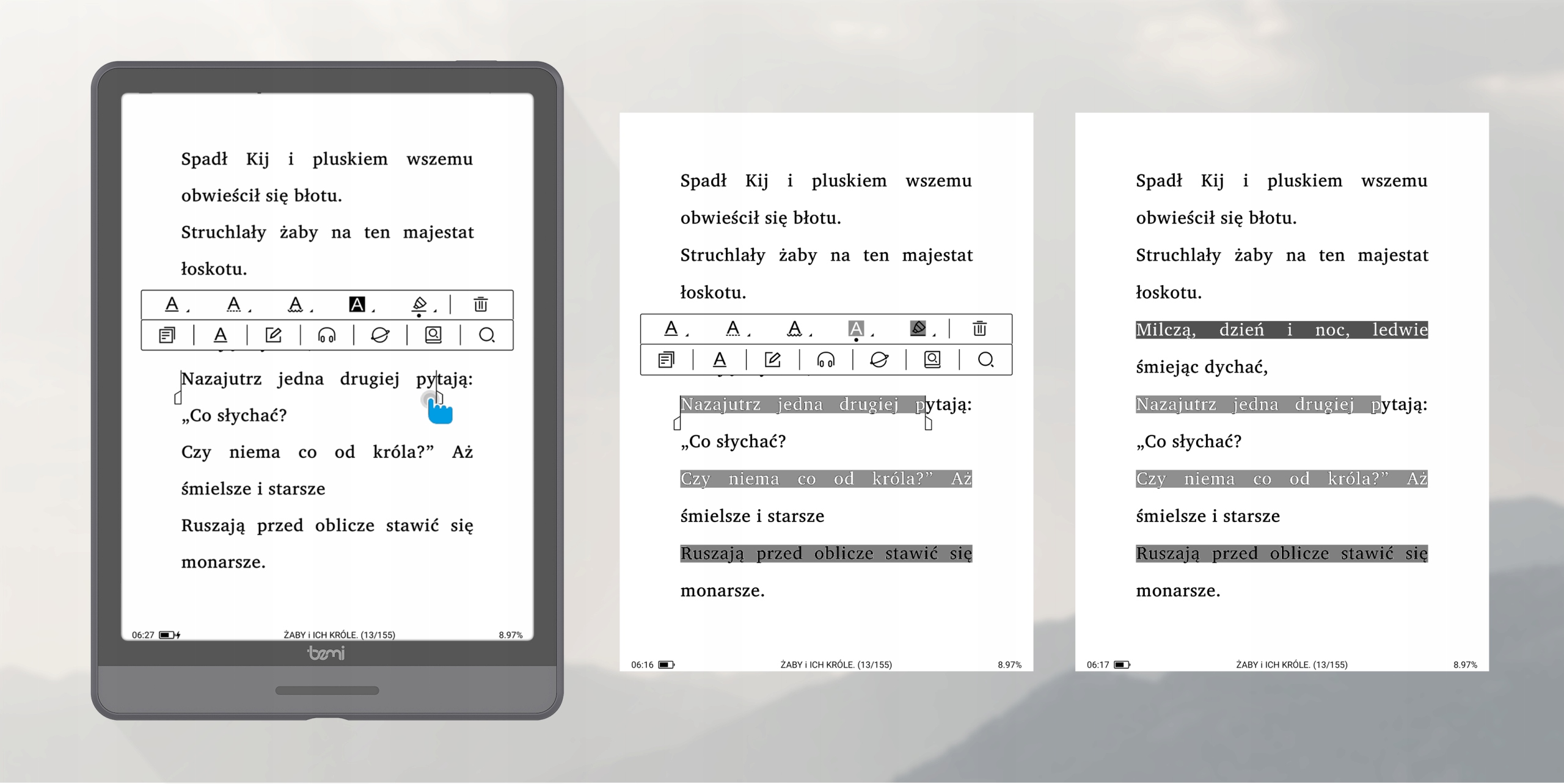 - Built-in additional applications: Legimi, Empik Go, Book Transfer, Audio Player, Calculator, Dictionary, Translator, File Manager, Gallery, Web Browser, App Store, navigation ball