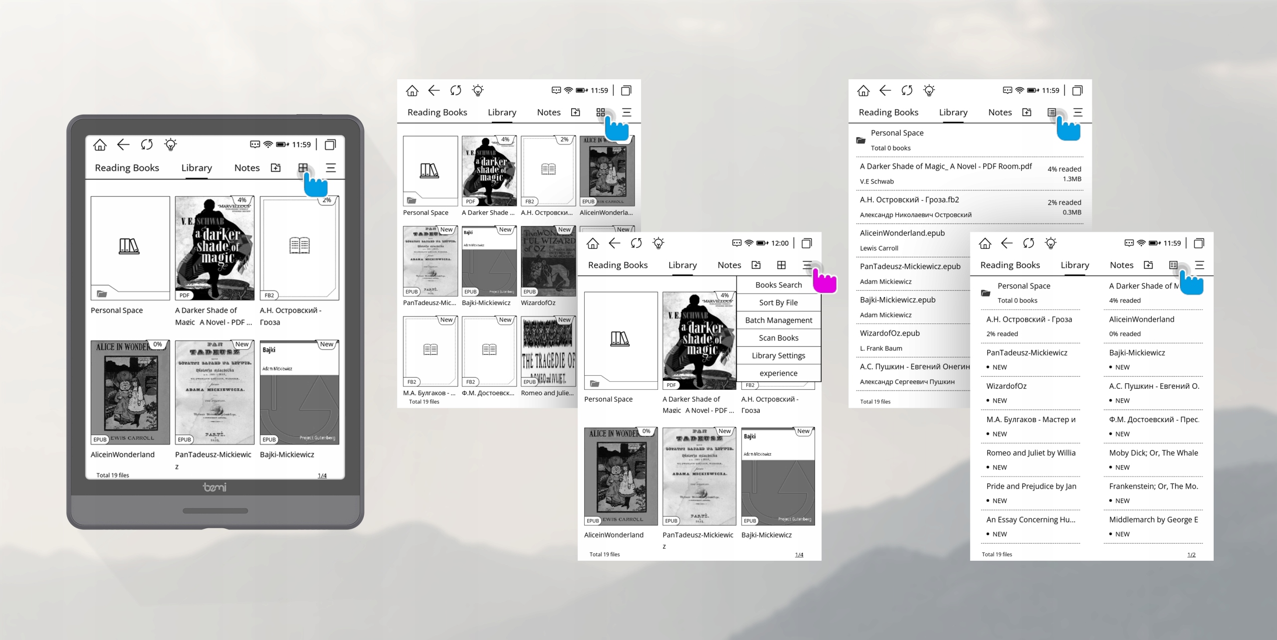 Cognita Tab 8 Pro allows you to display your library as tiles with book covers or a list of files, both in the internal memory and on a memory card if it is inserted in the reader.