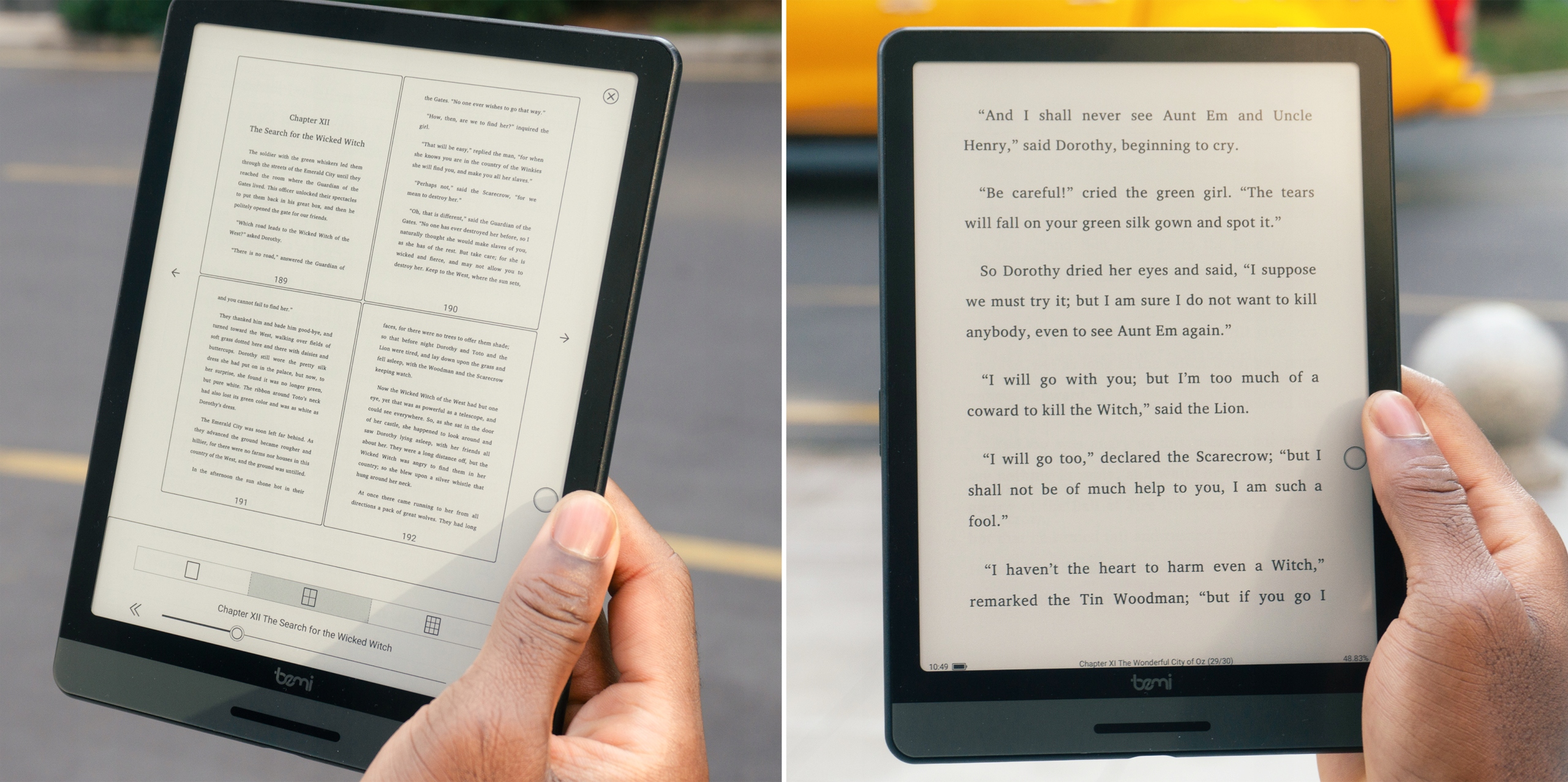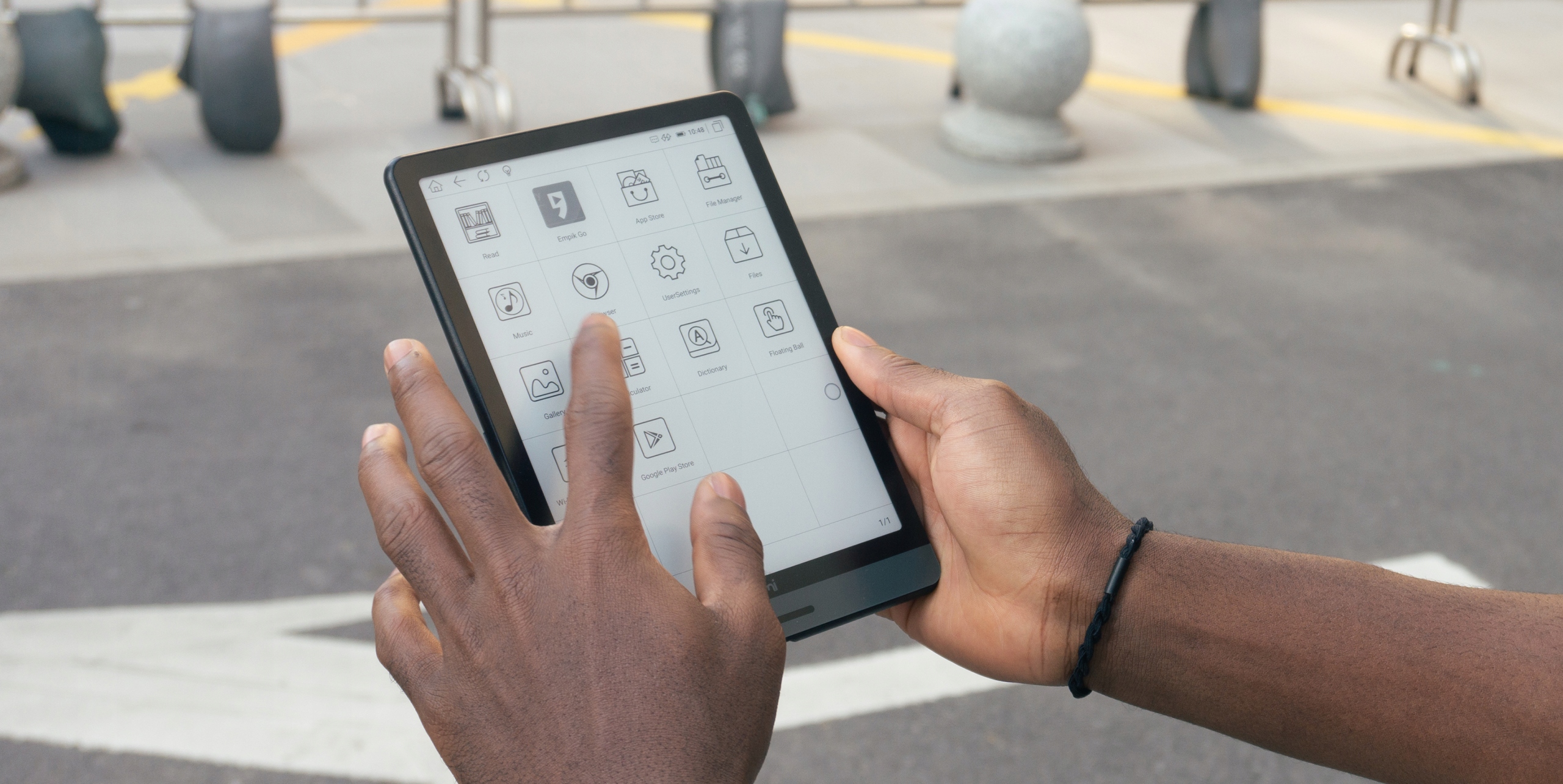 The reader has a 7.8" e-ink screen with a 16-step grey scale, which imitates the effect of traditional paper printing. The resolution of 1872 x 1404 pixels (300 ppi) ensures super comfortable reading in large format without eye strain. It is comfortable to read books, publications or diagrams with a lot of detail. The text is clear and easy to read.